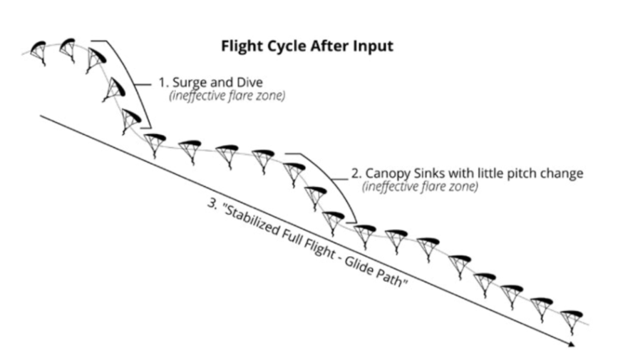 A fundamental characteristic of all parachutes is the "flight cycle" – the parachute's predictable response between an input (like pulling a toggle) and its return to stabilized full flight. To understand this, think of it like a swing coming to rest. When you push a swing, it goes forward, then slows, then swings back, slows again, and eventually settles. Your parachute behaves similarly.